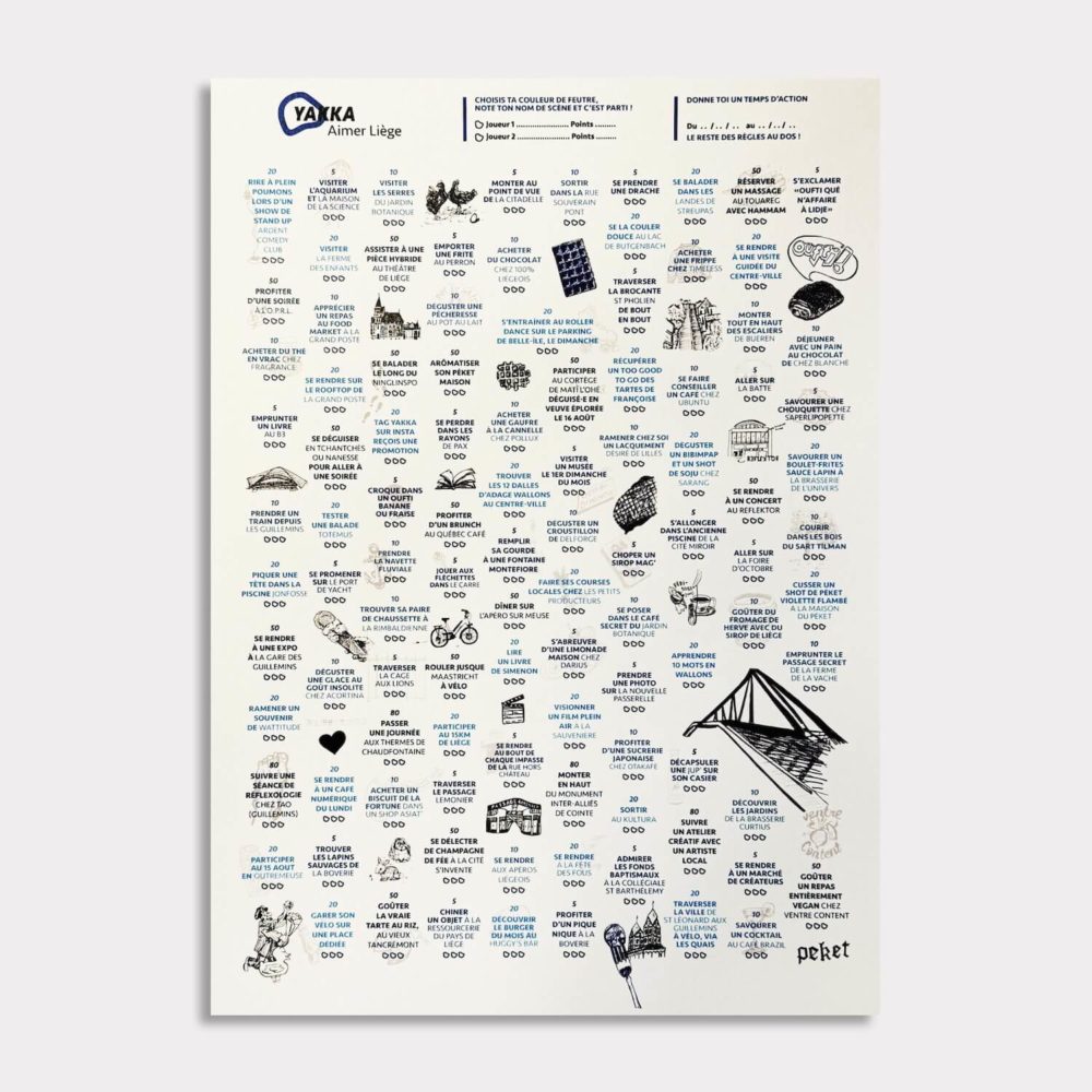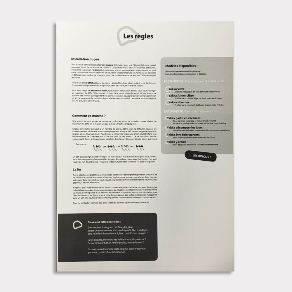 Selon le format, Yakka vous propose entre 5 et 100 idées d'activités à accomplir pour sortir de la routine, découvrir des activités insolites ou des références artistiques, culinaires, culturelles : réparties en catégories selon la difficulté, l'audace ou l'investissement nécessaire pour les réaliser et ayant une valeur en points.