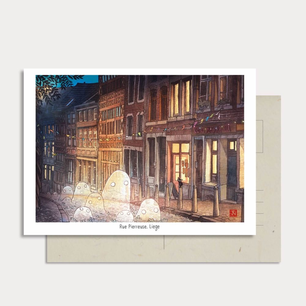 Jen Berger est une artiste illustratrice liégeoise. Elle crée des cartes postales qui illustrent des lieux célèbres qu'elle aime particulièrement de sa ville, Liège !