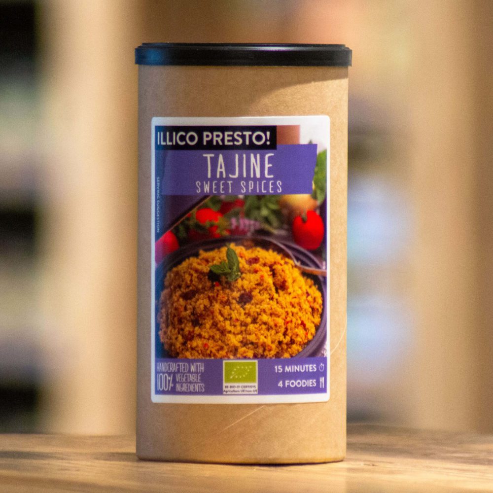 Ingrédients : Semoule de blé (GLUTEN)*, raisins*, carottes*, poivrons*, oignons*, sel aux herbes*, persil*, ail*, cannelle*, curcuma*, gingembre*.